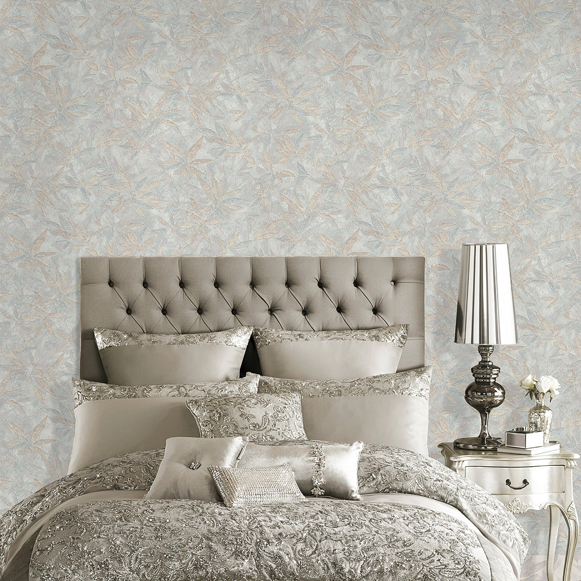 Золотой цвет обоев придает помещению изысканность и роскошь, а флористический стиль добавляет нотку натуры и свежести. Мотив листьев Eclectic привносит в интерьер элементы природы, создавая уютную и гармоничную атмосферу.
